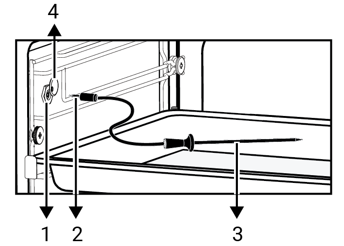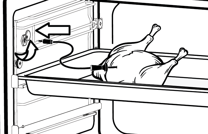 - Ön ısıtma tamamlandıktan sonra tepsinizi ilgili rafa yerleştirin. Koruyucu eldiven kullanarak, probun sensör ucunu etinize saplayın. Ön ısıtma sonrası fırın içi ve et probu sıcak olacağından koruyucu eldiveni mutlaka kullanmalısınız.