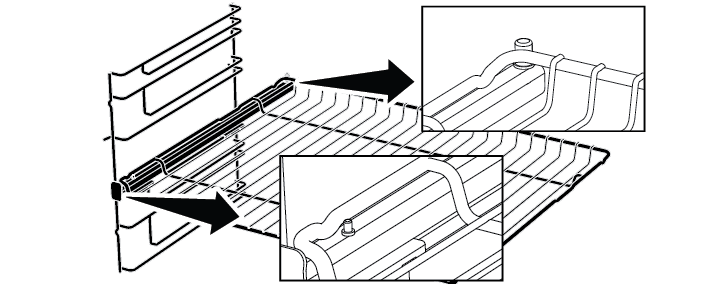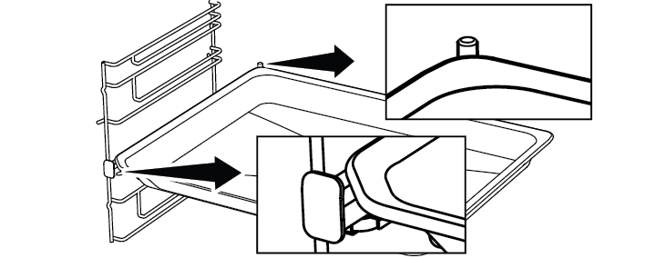 Существует также функция стопора, предотвращающая опрокидывание противня с направляющих. Вынимая противень, выньте его из заднего стопорного гнезда и потяните на себя, пока он не достигнет передней стороны. Вы должны пройти через это стопорное гнездо, чтобы полностью снять его.