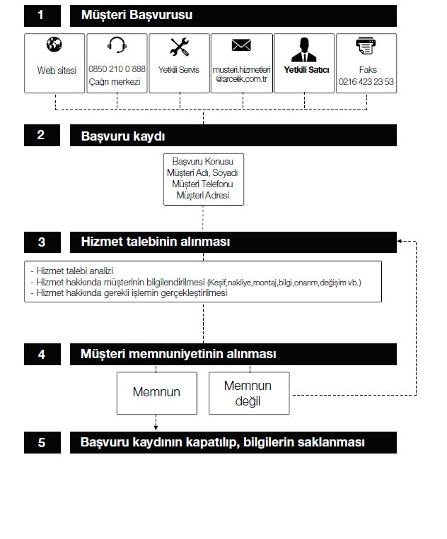 Müşterilerimizden iletilen istek ve önerilerin Arçelik’e ulaştığı bilgisini, müşteri profili ayrımı yapılmaksızın kendilerine 24 saat içinde veririz. Müşteri Hizmetleri sürecimiz: Müşterilerimizin istek ve önerilerini; - İzlenebilir, raporlanabilir, şeffaf ve güvenli tek bir bilgi havuzunda toplarız. - Yasal düzenlemelere uygun, objektif, adil ve gizlilik içinde ele alır ve değerlendiririz. - Bu geri bildirimleri süreçlerimizin daha mükemmel hale getirilmesinde kullanırız. Arçelik olarak, mükemmel müşteri deneyimini yaşatmayı ana ilke olarak kabul eder, müşteri odaklı bir yaklaşım benimseriz. Bütün süreçlerimizi yönetim sistemi ile entegre ederek birbirini kontrol eden bir yapı geliştirilmesini sağlarız. Yönetim hedeflerini de bu sistem üzerinden besleriz. | |