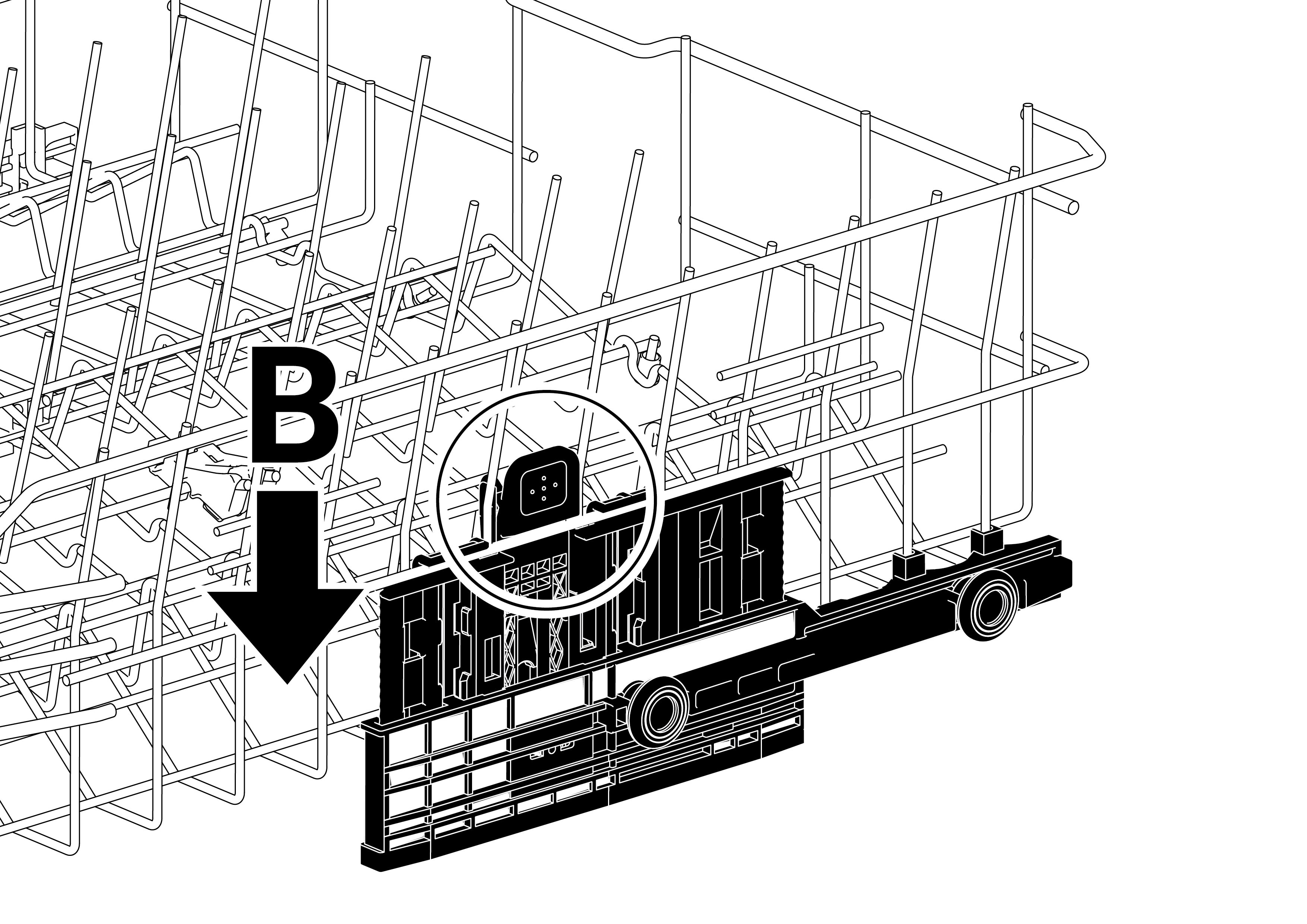 - Üst sepet tellerini iki elinizle tutup sepeti bir miktar yukarı kal-dırarak, şekilde gösterilen (B) mandallara aynı anda basıp bırakın.