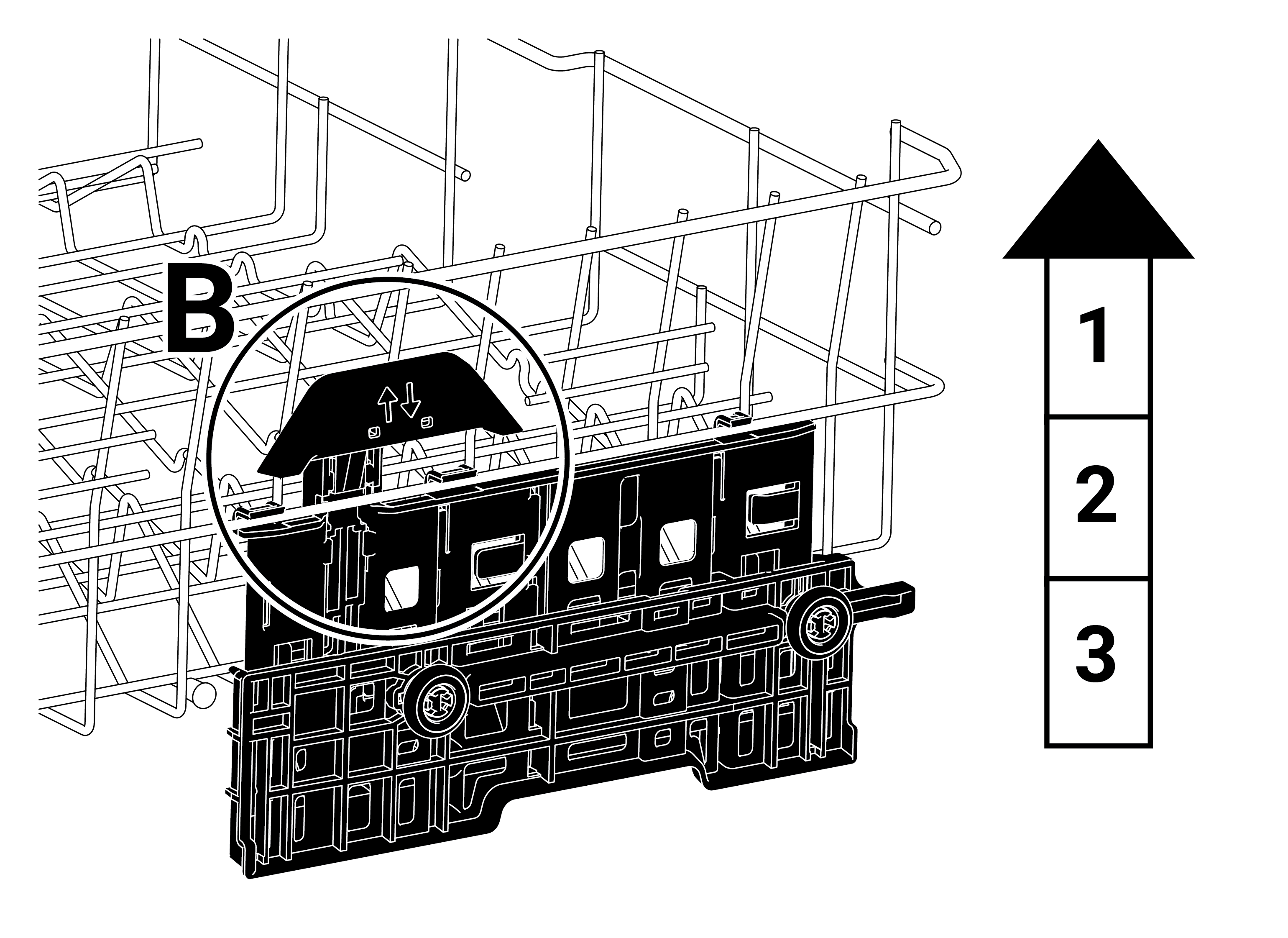 1. Sepetinizi yükseltmek için sepet en alt konumda iken üst sepet tellerini iki elinizle tutarak yukarıya doğru çekin (B)