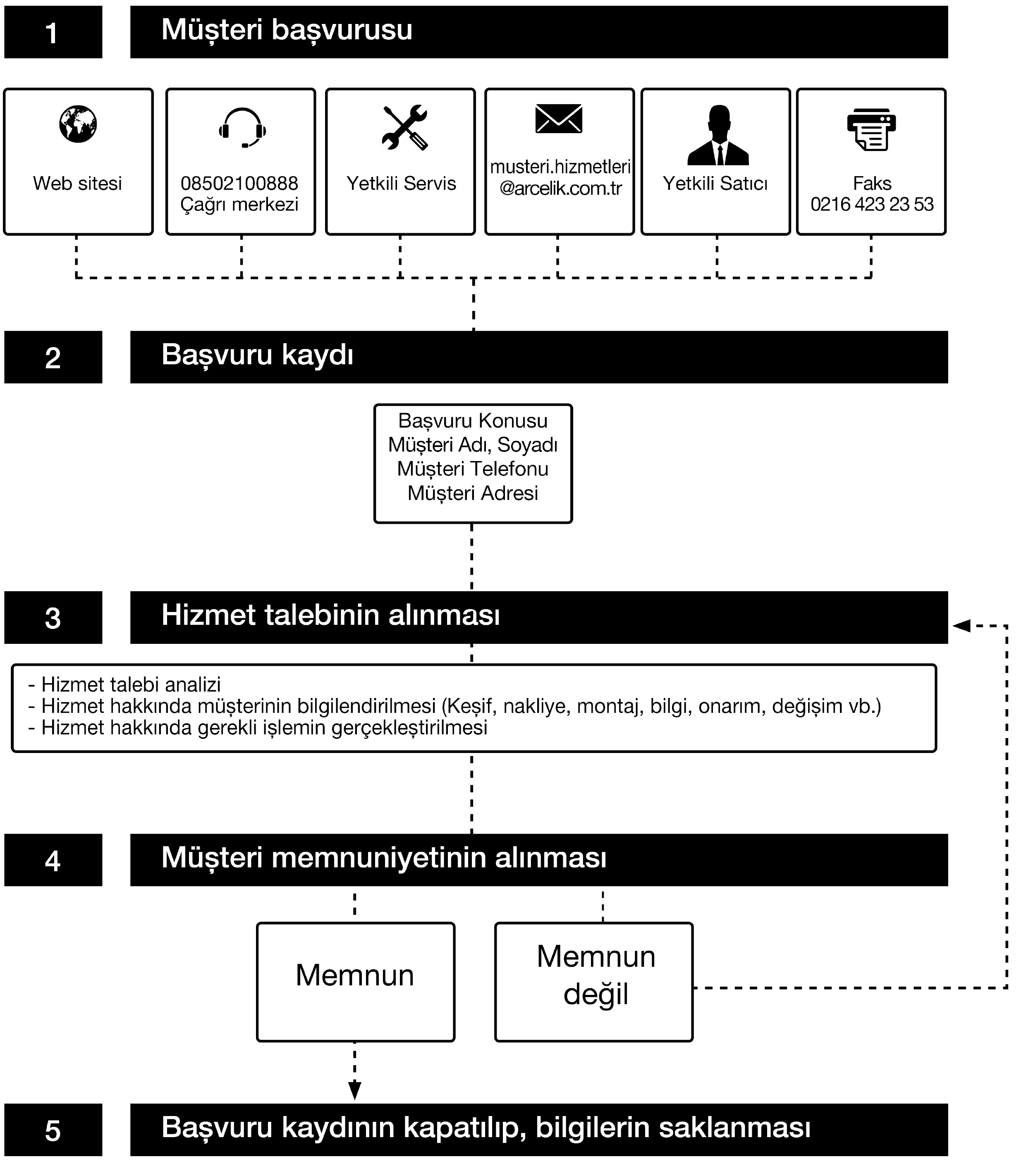 We inform our customer on the fact that their requests and suggestions are received by us within 24 hours, regardless of the customer profile. Our Customer Service process: Requests and suggestions of our customers; - are collected in a single, reportable, transparent and secure information pool. - are treated and evaluated objectively, fairly and confidentially in accordance with legal regulations. - we use these feedbacks to make our processes more perfect. As Arçelik , we consider maintaining the perfect customer experience as our main principle and adopt a customer-oriented approach. We ensure the development of a structure that checks each other by integrating all our processes with the management system. We also feed the management objectives through this system. | |