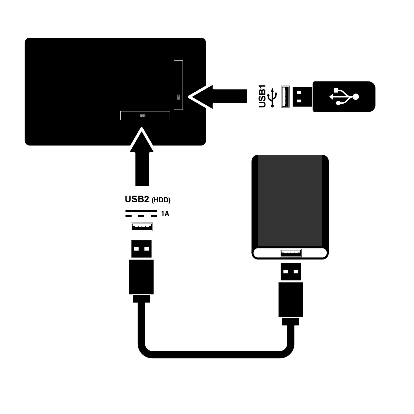 - Подключите внешний жесткий диск к порту USB2 (HDD) или подсоедините накопитель к портy USB1 телевизора.