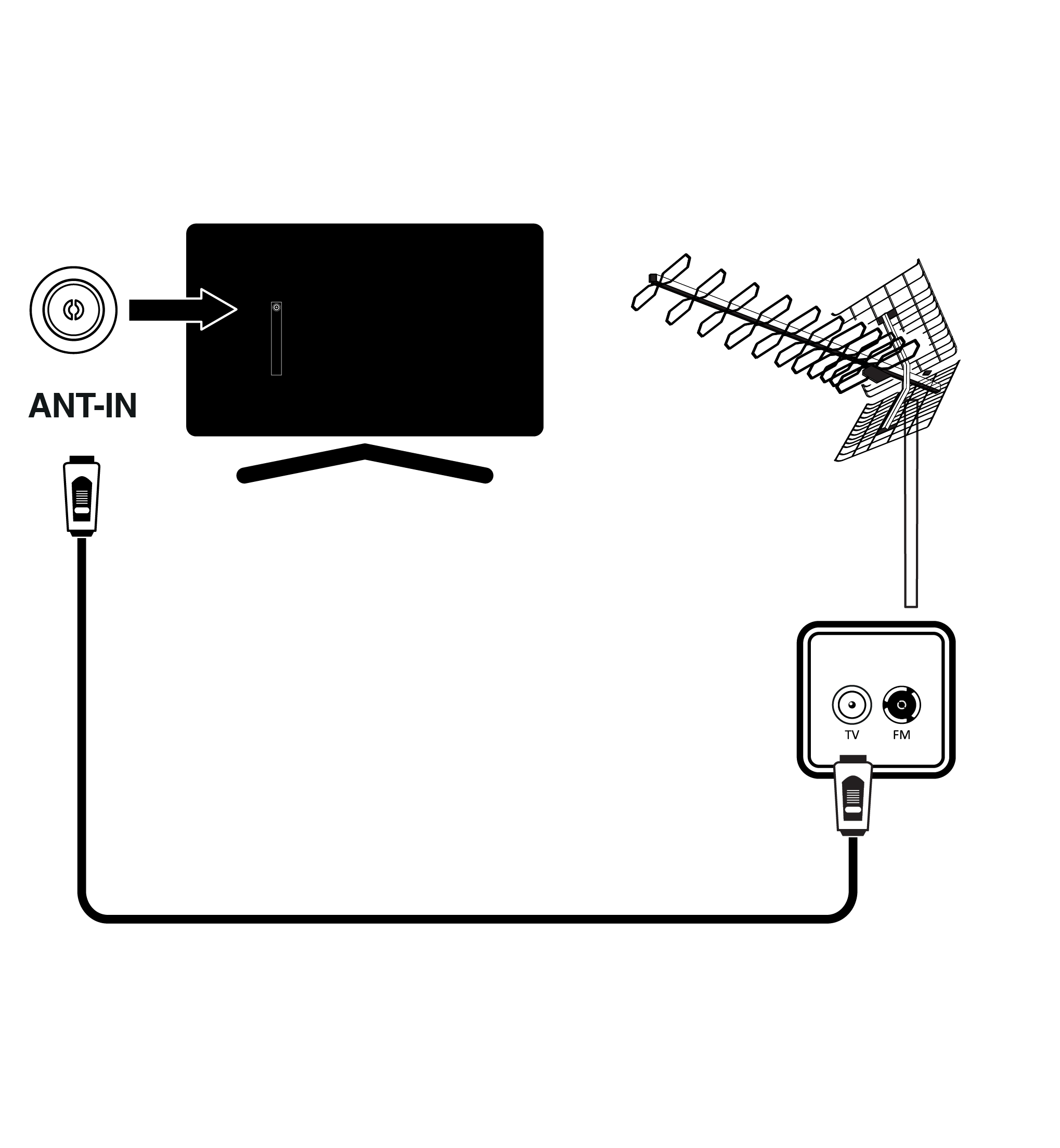 - To receive terrestrial digital channels (DVB- T), Digital cable channels (DVB-C) or Analogue broadcast channels, connect the antenna cable to the ANT IN socket on the television set.